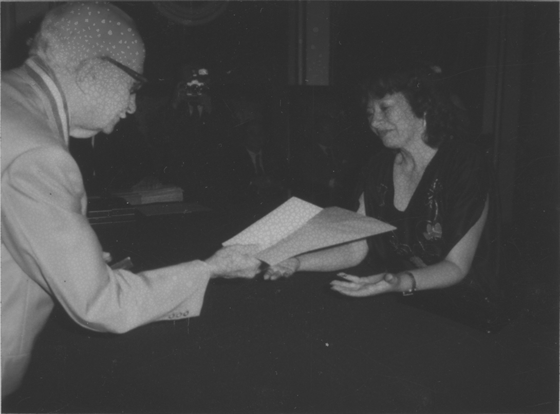 29. Recibiendo un diploma de manos del ex-Presidente José Luis Bustamante y Rivero, comienzos de los 80.
