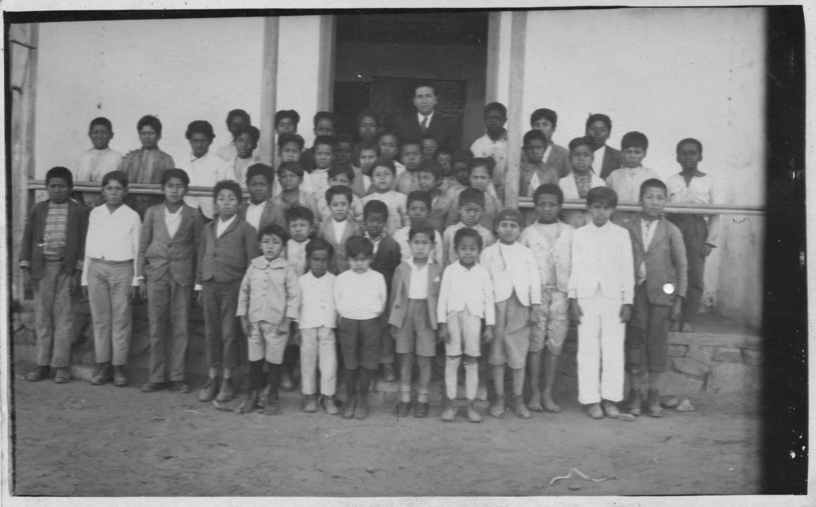 3. En Acarí, Don Pascual Bejarano, padre de Carmen Luz, con sus alumnos, en la casa-escuela que habitaron, donde nació la poeta.