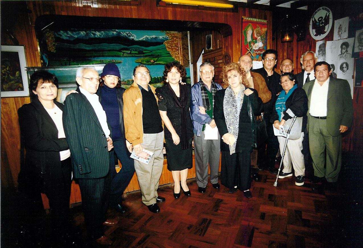 58. En un homenaje a ella. de izq. a der., entre otros, Carmen Flores, Reynaldo Naranjo, Marita Troiano, Manuel Velásquez, Maritza Núñez, Washington Delgado, Germán Carnero, Eduardo Rada, Manuel Pantigoso y Esther Castañeda, café Curich, mayo 2001.