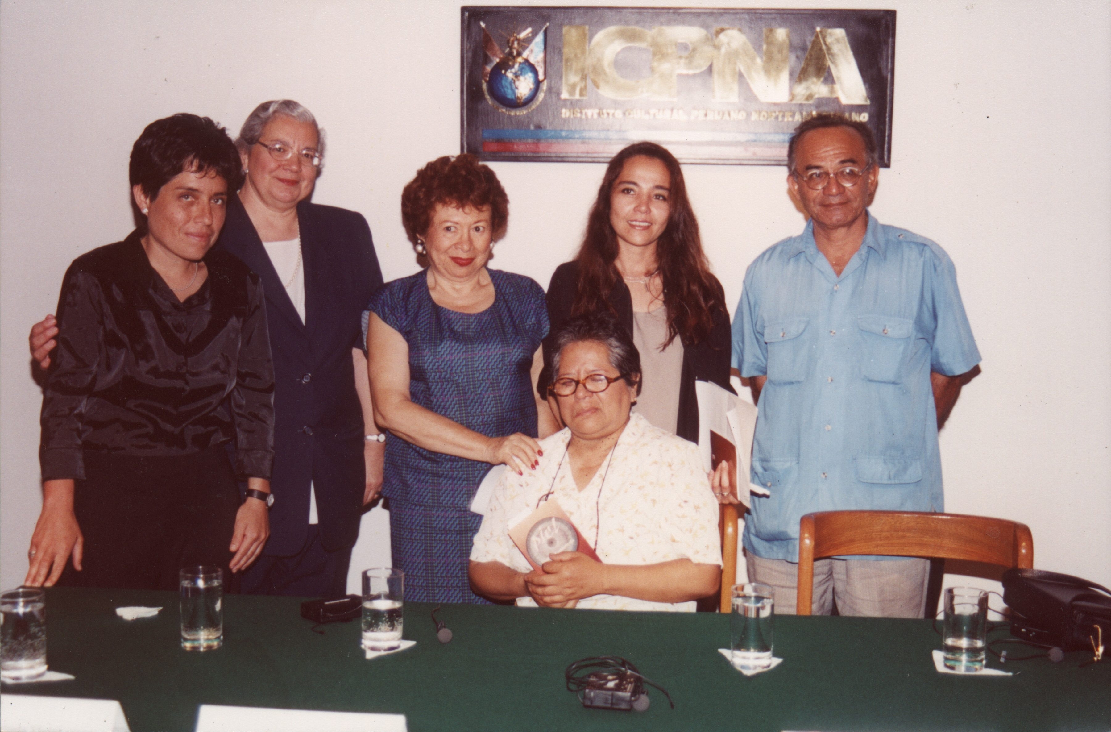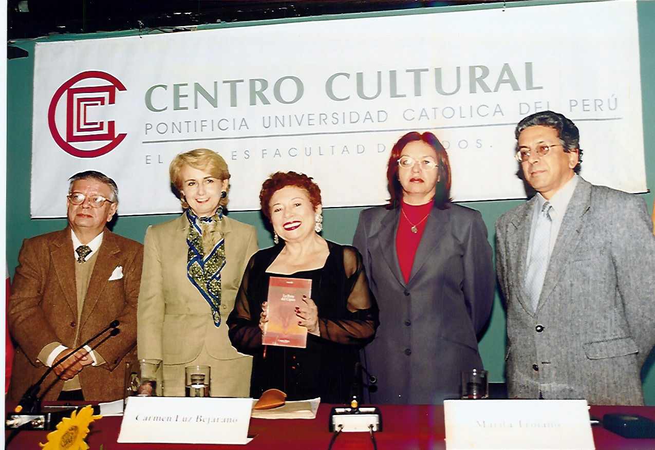 48. Durante el Encuentro Internacional Mujeres de la Literatura, Universidad de Lima, 1999, de izq. a der. Francesca Denegri, el Dr. Jorge Cornejo Polar, Carmen Luz, la Rectora Dra. Ilse Wisotzki Loli, Nelly Talavera de Cornejo y Marita Troiano.
