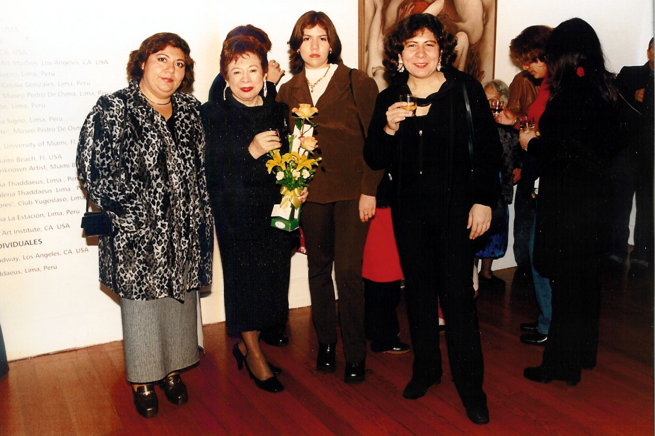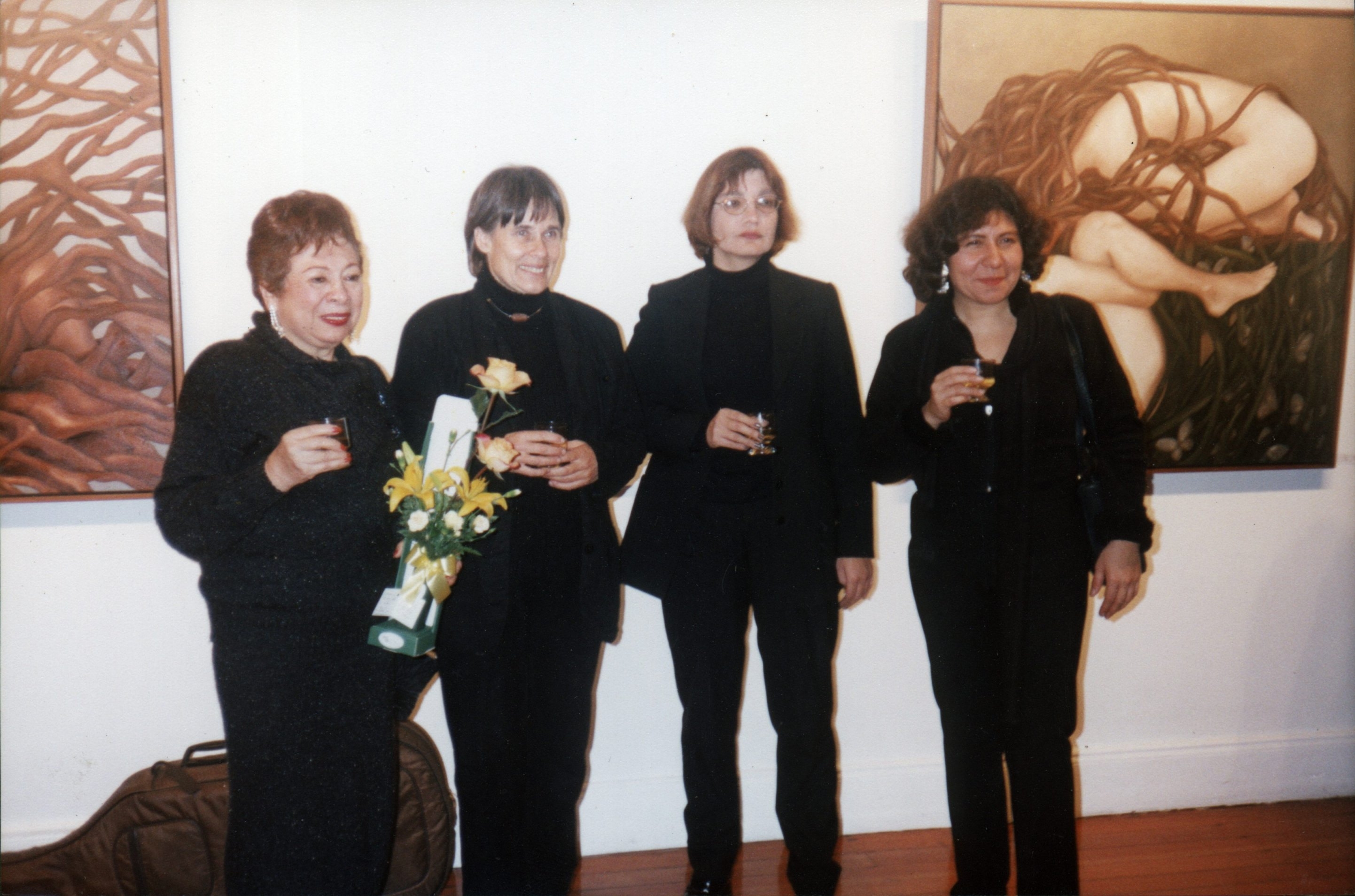 76. En la presentación de Piel de Esther Castañeda en el ICPNA. De izq. a der., Violeta Barrientos, Martha Fernández, Carmen Luz, Esther, May Rivas y Cronwel Jara, 11.3.2002.
