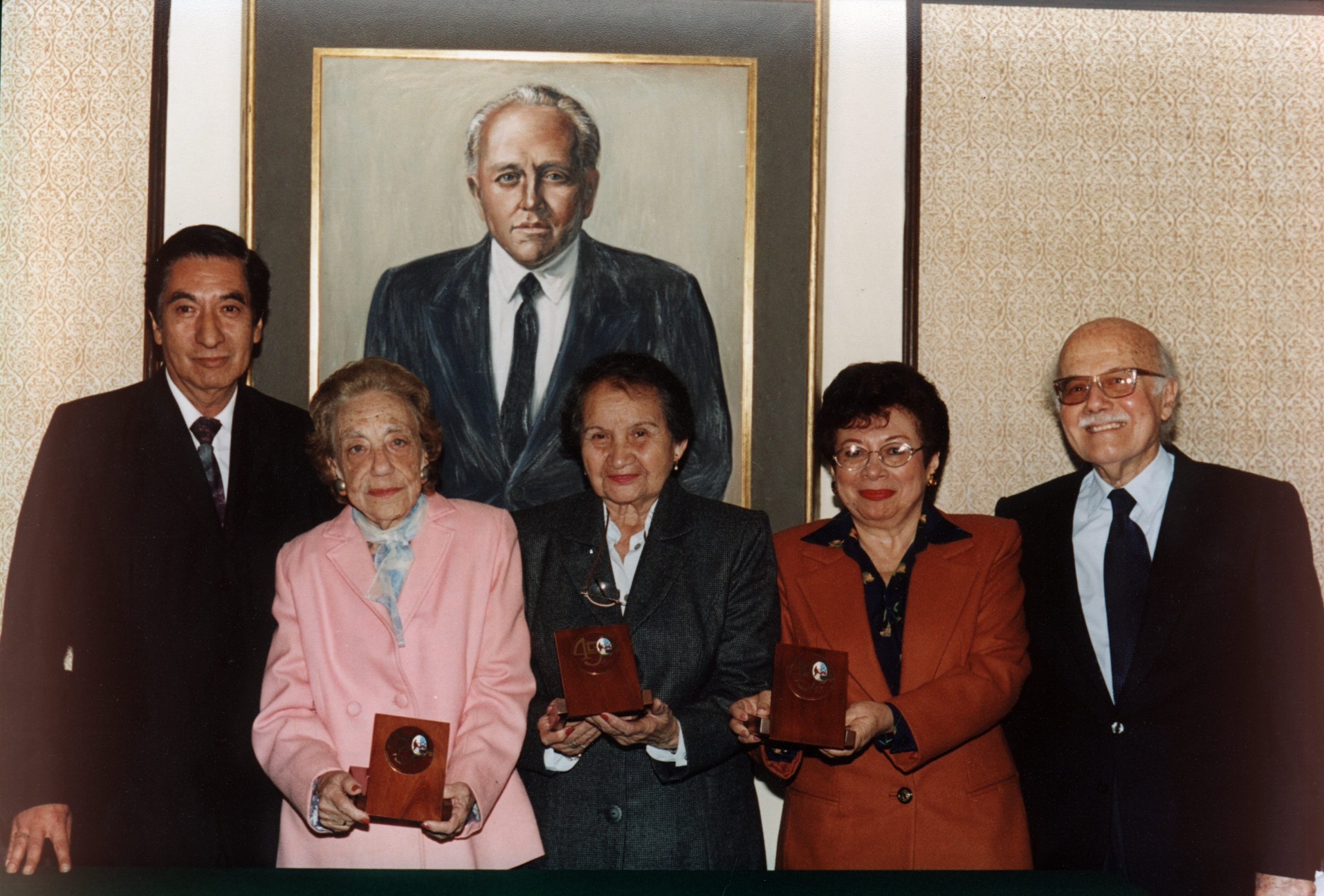 72. Yolanda Westphalen, Aída Calderón de Cornejo (madre de María Emilia) y Carmen Luz durante el homenaje rendido a ellas en el Tercer Encuentro de Poetas Sanmarquinas, 29.10.2001. Con ellas, el Decano Dr. César Kruger, y el Dr. Jorge Puccinelli (a la der.).